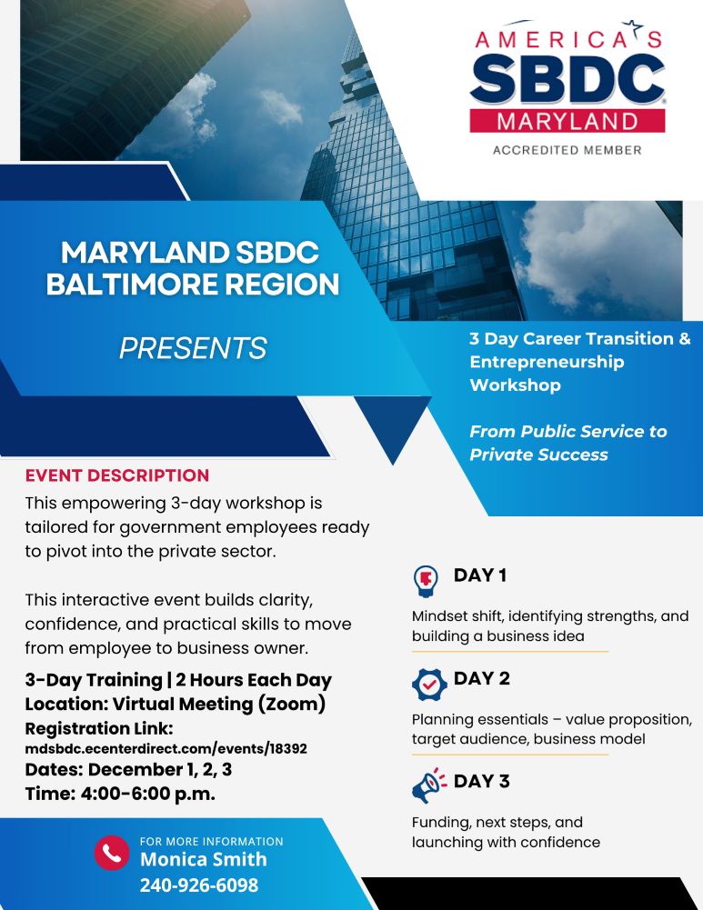 We are excited to announce “From Public Service to Private Success: A Career Transition & Entrepreneurship Workshop”, a free, 3-day virtual training series designed specifically for public service employees exploring career changes or interested in launching their own business.